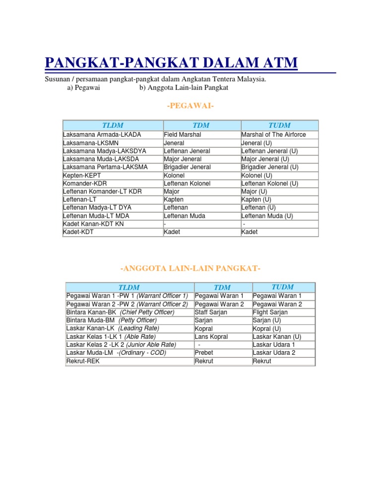 Tentera laut tldm tentera udara tudm raja raja melayu dan atm. Untuk tanda kepangkatan di angkatan darat malaysia tanda pangkat untuk perwira senior dan perwira junior menyelaraskan dengan anugerah darjah utama seri mahkota negara. Anggota yang berjaya menamatkan latihan asas ketenteraan akan dinaikkan ke pangkat laskar udara ii dan ditempatkan di dalam perjawatan tentera udara diraja malaysia tudm mengikut kepakaran dan cawangan yang telah ditetapkan. Berikut ini adalah tanda pangkat untuk masing masing perwira angkatan darat angkatan laut dan.